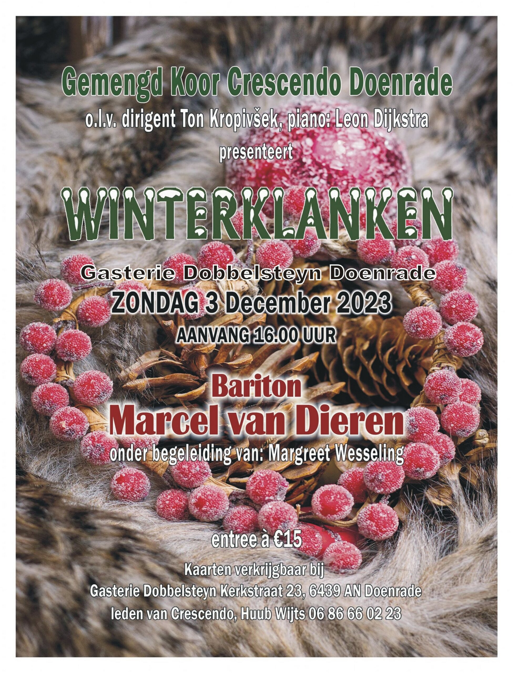 het concert wordt gehouden op zondag 6 april om 15.00 uur in gasterie Dobbelsteyn, Kerkstraat 23 in Doenrade.